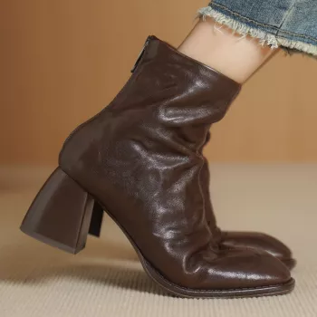 Women's Genuine Leather Pleated Ankle Boots – Square Toe, 6.5cm Heel
